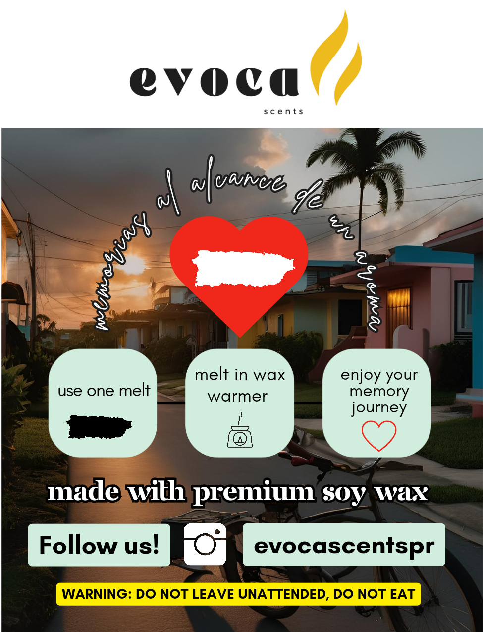 Wax Melts elaborados 100% a mano en PR con cera de soya natural y fragancias de alta calidad a base de aceites esenciales y colorantes naturales, pueden ser disfrutados con tu "wax warmer" favorito, para muchas horas de aromas y fragancias.